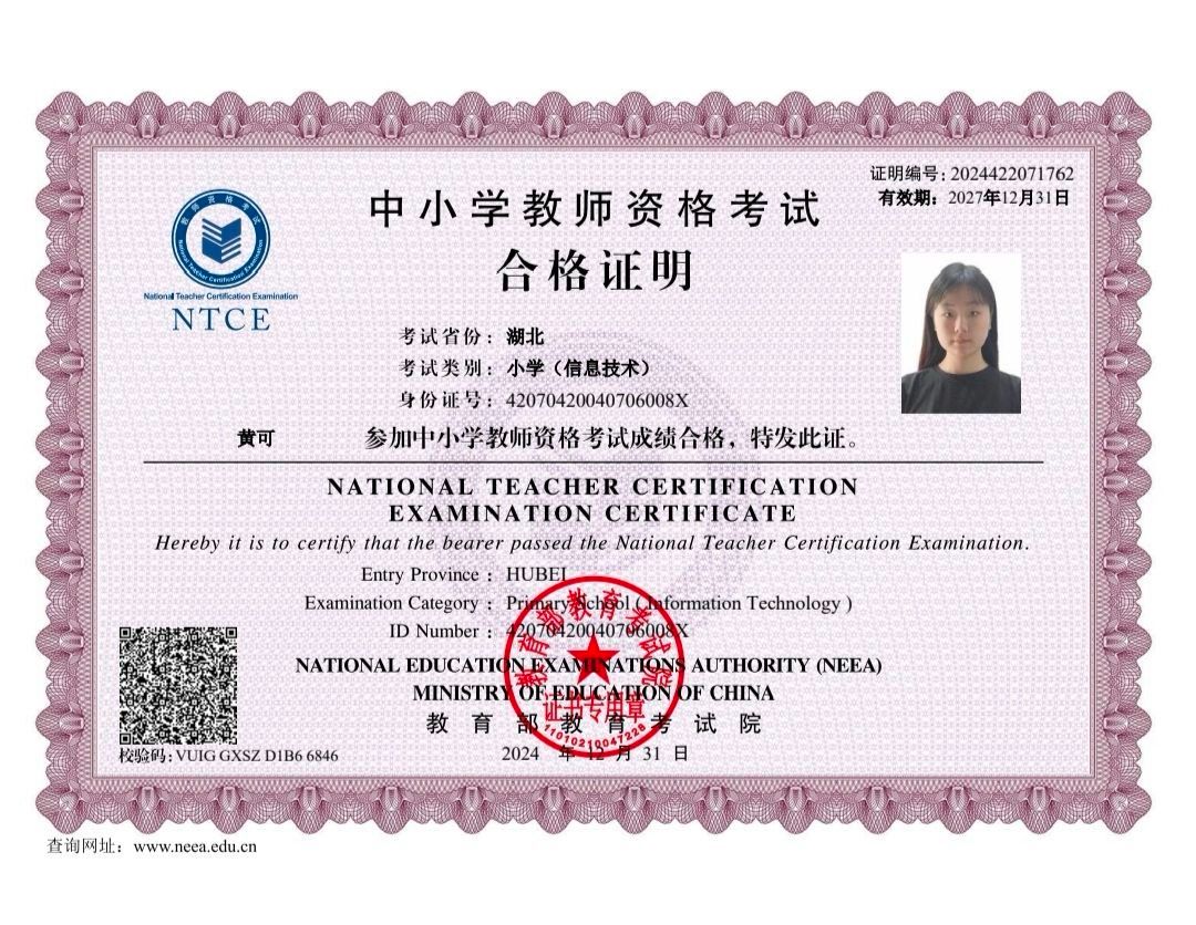 自踏入咸宁职业技术学院的校门,她便为自己定下了清晰的学习目标——夯实专业基础,考取实用证书,为未来发展积蓄力量。她主动挑战英语四级考试,每天坚持晨读背单词、晚上刷题练听力,克服了英语学习的畏难情绪,最终顺利通过;面对中小学教师资格证的严苛考核,她系统梳理教育学、心理学知识点,反复打磨试讲流程,凭借扎实的专业功底和从容的临场表现成功获证;此外,她还考取计算机二级证书、普通话二甲证书,用硬核实力为自己的简历增添亮色。扎实的学习态度让她连续两个学年斩获国家励志奖学金,成为同学们眼中“靠谱又优秀”的学习榜样。