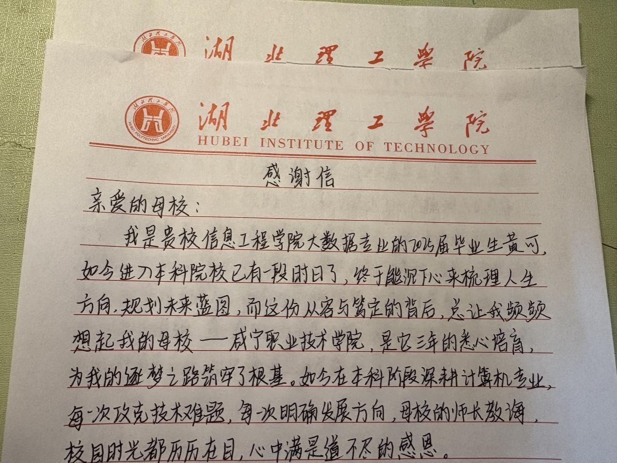 从连续两年斩获国家励志奖学金,到手握多项实用证书,从班级里的“热心学委”到竞赛场上的“实力选手”,再到圆梦本科的追光者,她以认真的学习态度、热忱的处事风格、坚定的追梦信念,在咸职的三年时光里不断成长、不断突破。正如她给辅导员的信中所说那样,咸职是她逐梦之路的起点,而未来,带着这份勤奋与热忱,她必将在更广阔的天地里,书写出更加精彩的人生篇章。