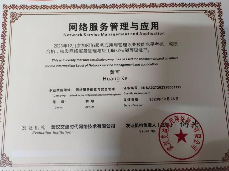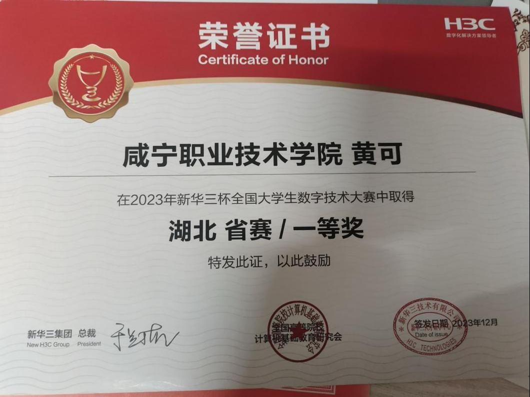 个性开朗、乐于助人的黄可,从不把自己局限在书本里。在校园活动中,她更是活力满满。作为校级优秀共青团员,她积极参与团组织的各类志愿服务和主题活动,用实际行动践行团员的责任与担当;在专业竞赛的舞台上,她凭借过硬的数字技术能力,在2023年“新华三杯”全国大学生数字技术大赛中脱颖而出,斩获湖北省一等奖的好成绩。无论是班级工作还是校园活动,她都以饱满的热情投入其中,在服务他人、挑战自我的过程中,让青春绽放出别样光彩。