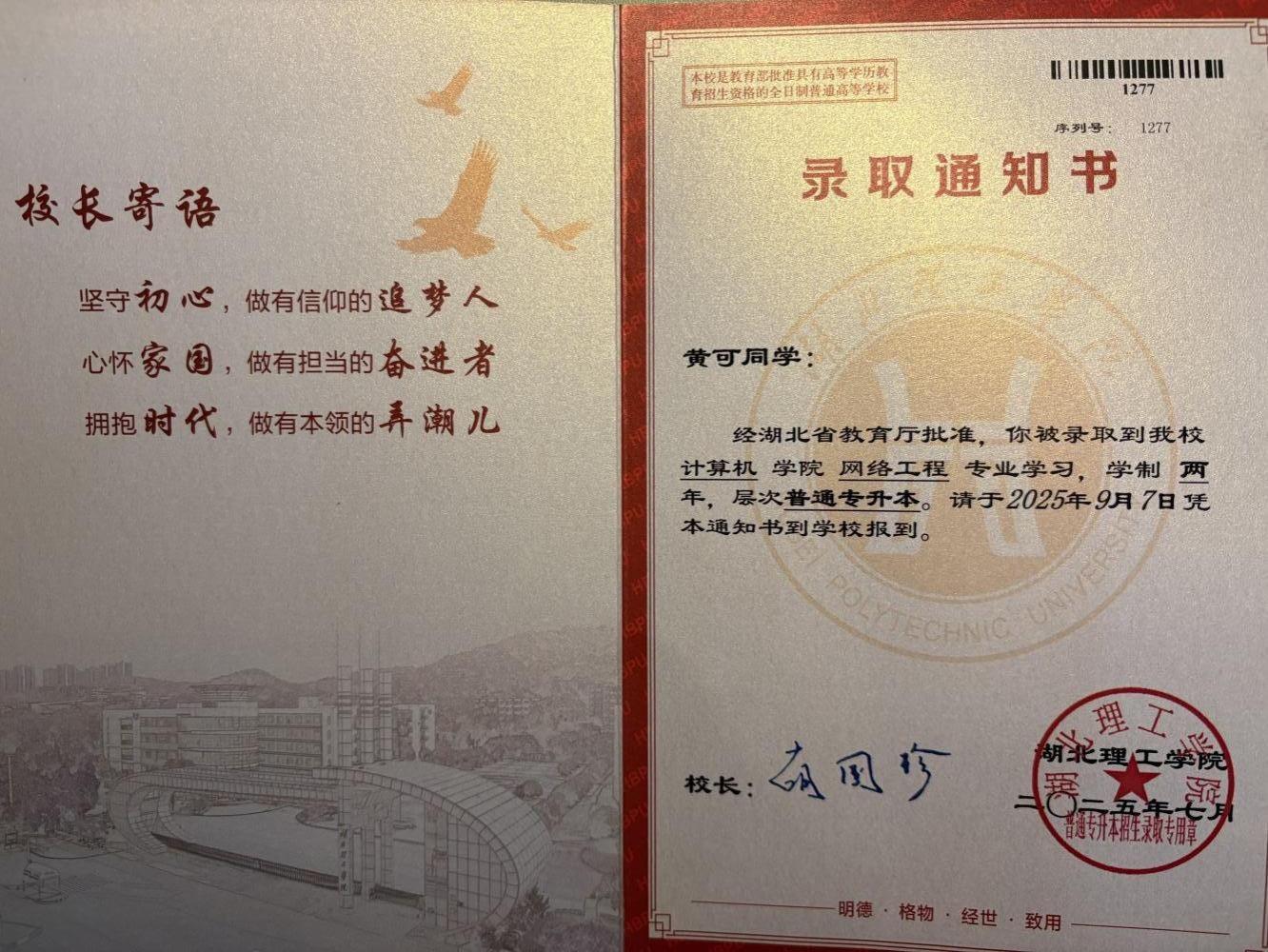 湖北理工学院录取通知书
