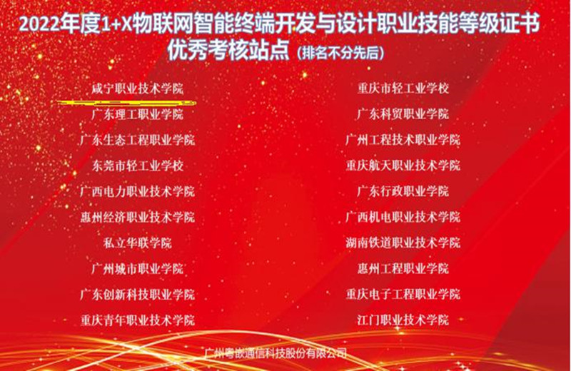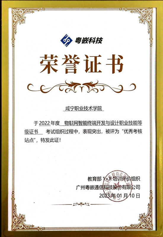 近日从广州粤嵌通信科技股份有限公司获悉,我校被教育部1+X物联网智能终端开发职业教育培训评价组织评为2022年度1+X物联网智能终端开发职业技能等级证书“优秀考核站点”。